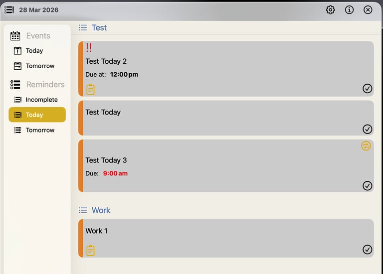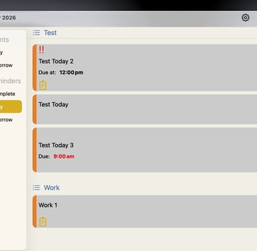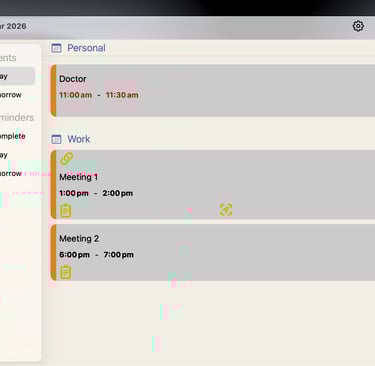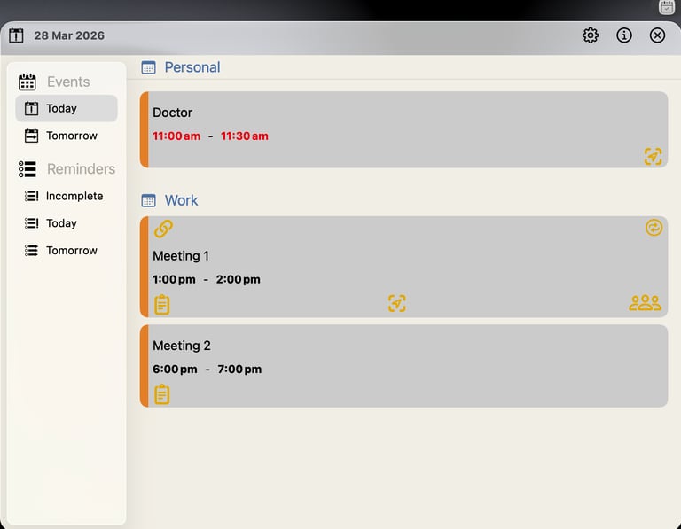 Calquicky is a small macOS 26 (and above) app that allows you to easily view your upcoming calendar events and reminders.